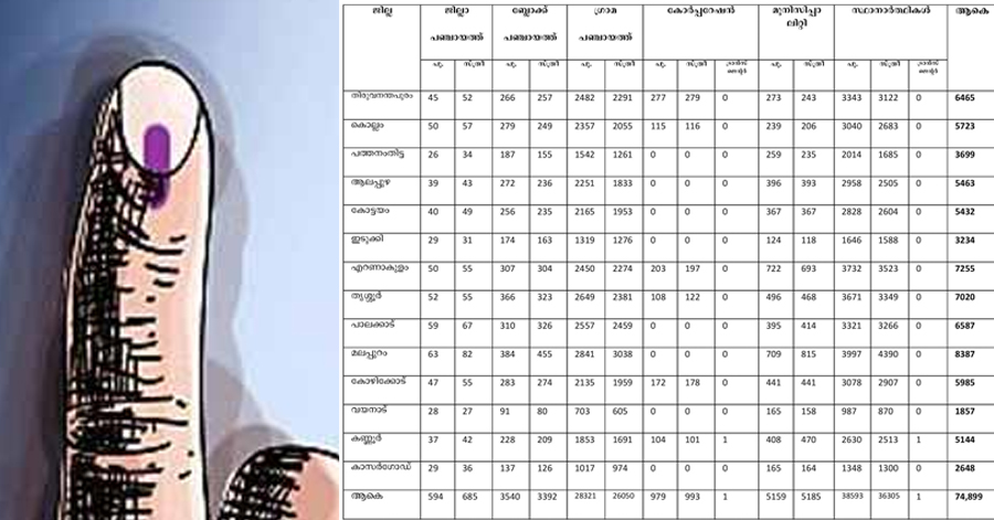 തദ്ദേശ തിരഞ്ഞെടുപ്പിൽ സംസ്ഥാനത്താകെ മത്സരരംഗത്തുള്ളത് 74,899 സ്ഥാനാർത്ഥികൾ. 38,593 പുരുഷൻമാരും 36,305 സ്ത്രീകളും ട്രാൻസ്ജെന്റർ വിഭാഗത്തിൽ നിന്നും ഒരാളുമാണ് മത്സരരംഗത്തുള്ളത്.