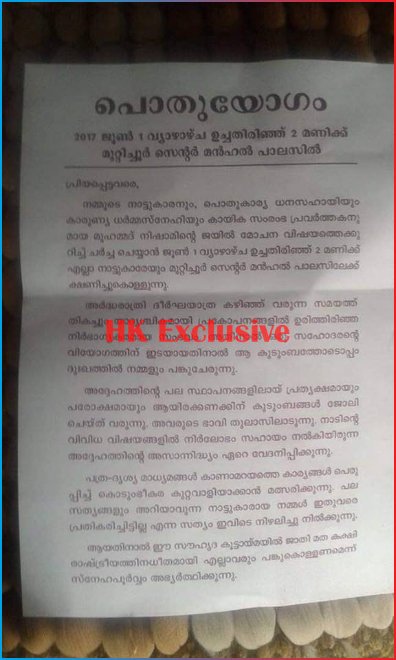 12000 ത്തോളം തൊഴിലാളികള് സ്വന്തമായുള്ള പുകയില തോട്ടം,കേരളത്തിനകത്തും പുറത്തും വന്കിട റിയല് എസ്റ്റേറ്റ് ബിസിനസ് ,പക്ഷെ കറപുരളുന്ന ജീവിതത്തേയായിരുന്നു മനസു കൊണ്ട് നിഷാം എന്ന കൊലപ്പുള്ളി ഇഷ്ടപ്പെട്ടിരുന്നത്.സെക്യൂരിറ്റി ജീവനക്കാരനായിരുന്ന ചന്ദ്രബോസിനെ വാഹനമിടിപ്പിച്ച് കൊല്ലുന്നതു വരെ നിഷാമിന്റെ തോന്യവാസങ്ങള് നാടാകെ അറിഞ്ഞില്ല.ക്രൂരനാണെന്നറിയാവുന്നവര് വിരളമായിരുന്നു . കിങ് നിഷ#ാമായിരുന്ന മുഹമ്മദ് നിഷാം കില്ലര് നിഷാമായതത് നാട്ടുകാര്ക്കങ്ങ് സഹിച്ചിട്ടില്ല.നിഷാമിനെ മോചിപ്പിക്കാനും നല്ലവരായ നാട്ടുകാരുടെ സൗഹൃദ കൂട്ടായ്മ ഒരുങ്ങുന്നു.മുറ്റിച്ചൂര് സെന്റര് മല്ഹല് പാലസിലാണ് നിഷാമിനു വേണ്ടി ഒത്തുകൂടാന് നാട്ടുകാരേ ക്ഷണിച്ചിരിക്കുന്നത്.പൊതുയോഗ ക്ഷണക്കത്തില് നമ്മുടെ നാട്ടുകാരനും ,പൊതുകാര്യ ധനസ്നേഹിയും കാരുണ്യ ധര്മ്മസ്നേഹിയും കായിക സ്നേഹിയുമായ നിഷാമിന്റെ ജയില് മോചനത്തിനായുള്ള കൂട്ടായ്മ എന്നാണ് അഭിസംബോധന ചെയ്തിരിക്കുന്നത്.ജൂണ് 1 ന് വ്യാഴാഴ്ച ഉച്ചതിരിഞ്ഞാണ് പൊതുയോഗം നടത്തുന്നത്.