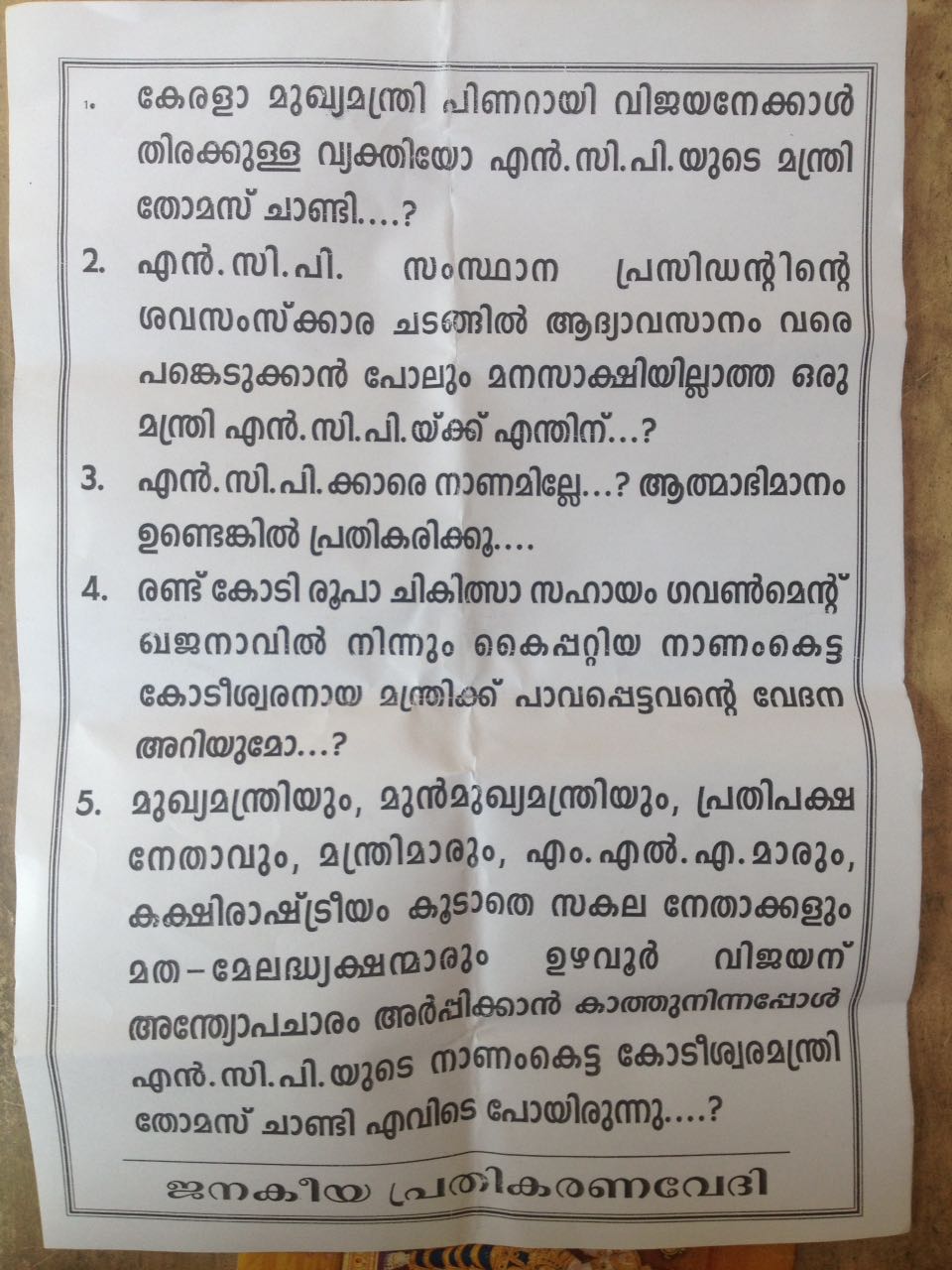 എന്നാല്‍സ്വന്തം പാര്‍ട്ടിയുടെ സംസ്ഥാന പ്രസിഡന്റിന്റെ മരണാനന്തര കര്‍മ്മങ്ങളില്‍ പൂര്‍ണമായും പങ്കെടുക്കാതെ തോമസ് ചാണ്ടി എവിടെയായിരുന്നുവെന്ന് ജനകീയ പ്രതികരണവേദിയാണ് ചോദിക്കുന്നത്.ഇത്ര മനസാക്ഷിയില്ലാത്ത ഒരു മന്ത്രി എന്‍സിപിയ്ക്ക് എന്തിനാണെന്നാണ് ജനകീയ പ്രതികരണ വേദിയുടെ ചോദ്യം.എന്‍സിപിക്കാര്‍ക്ക് നാണമില്ലേയെന്നും,ആത്മാഭിമാനം ഉണ്ടെങഅകില്‍ പ്രതികരിക്കാനുമാണ് അവര്‍ ആവശ്യപ്പെടുന്നത്.