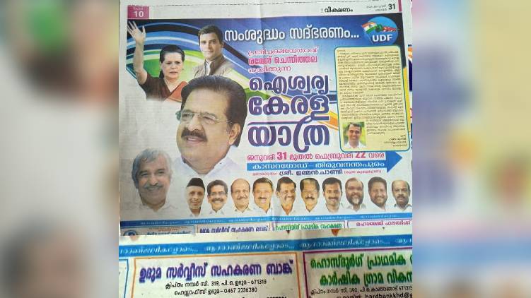 പ്രതിപക്ഷ നേതാവ് രമേശ് ചെന്നിത്തല നയിക്കുന്ന ഐശ്വര്യകേരള യാത്രക്ക് 'ആദരാഞ്ജലികള്' അര്പ്പിച്ച് വീക്ഷണം പത്രത്തില് പരസ്യം വന്ന സംഭവത്തില് രണ്ട് more...